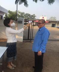 ຮູບພາບ: ການກວດກາປ້ອງກັນ ການແຜ່ເຊື້ອ ກ່ອນເຂົ້າໄປໃນ ບໍລິເວນດ້ານໃນຂອງບ່ອນເຮັດວຽກ (ໂຮງງານຜະລິດຢາເລກ3)