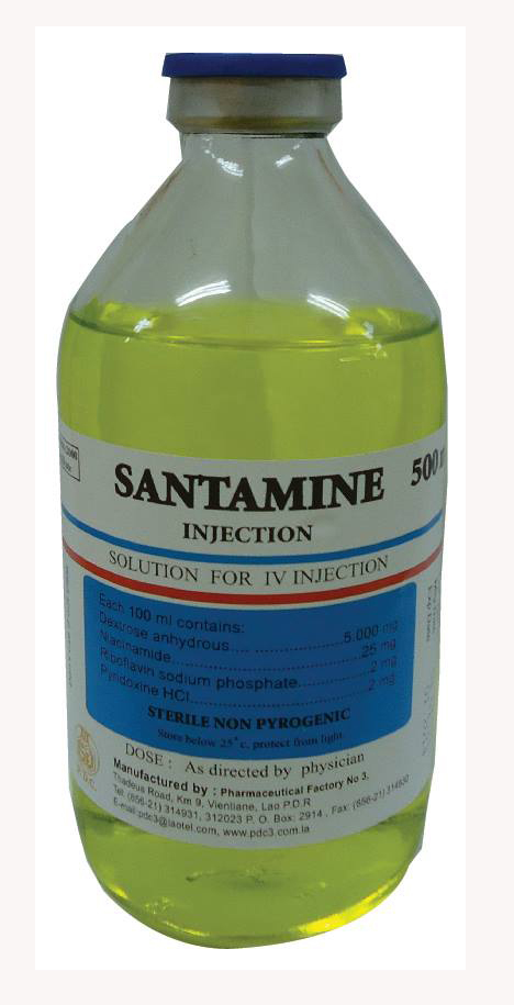 ຊື່ການຄ້າ/Product Nam: SANTAMINE ສ່ວນປະກອບ/ Composition Each 100ml contains: Pyridoxine HCL 2mg Dextrose anhydrous 5,000mg Niacinamide 25mg Riboflavin sodium phosphate 2mg ຂະໜາດ Size: 500ml/ ການບັນຈຸ / Packaging:12 FL/carton ຄຸນປະໂຫຍດ/ Indication -
