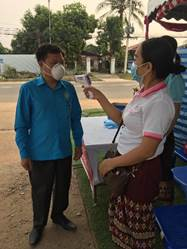 ຮູບພາບ: ການກວດກາປ້ອງກັນ ການແຜ່ເຊື້ອ ກ່ອນເຂົ້າໄປໃນ ບໍລິເວນດ້ານໃນຂອງບ່ອນເຮັດວຽກ (ໂຮງງານຜະລິດຢາເລກ3)